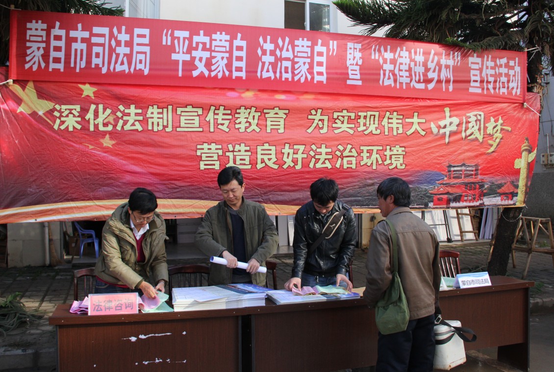 为进一步贯彻落实“六五”普法规划,积极推进新形势下农村法制宣传教育工作,切实提高群众学法、知法、守法、用法的意识,10月30日,蒙自市司法局深入芷村镇,开展“蒙自市司法局‘平安蒙自 法治蒙自’暨‘法律进乡村’”街头普法活动。