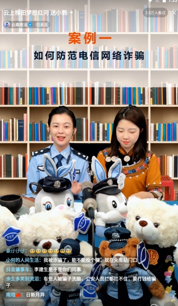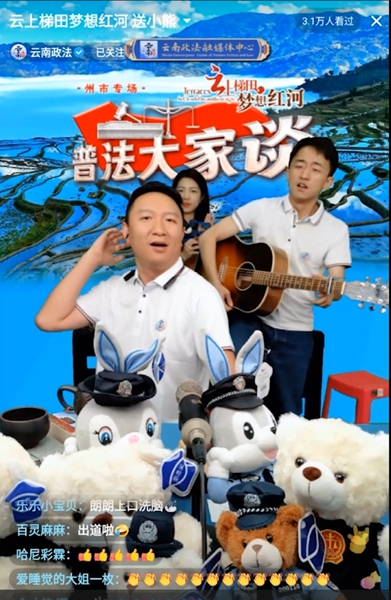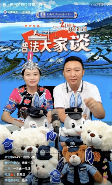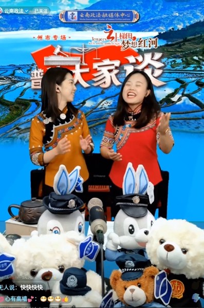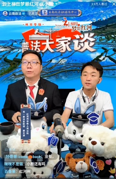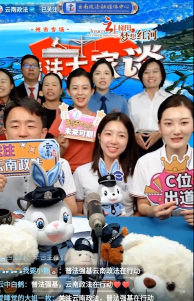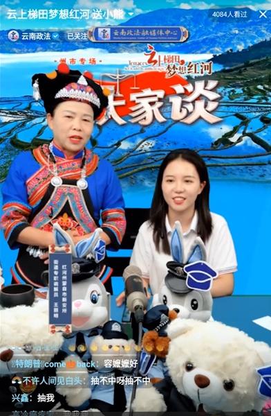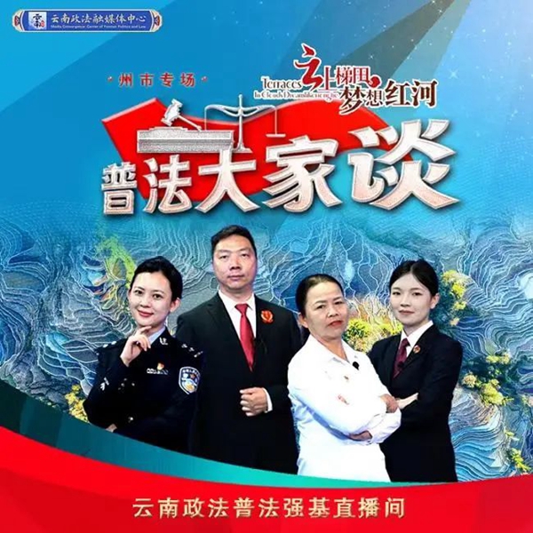 9月27日上午11时30分,云南政法普法强基直播间“云上梯田·梦想红河 普法大家谈”红河专场在红河州普法强基网络宣传大使哈尼彩霖清唱的《庆贺丰收的哈尼古歌》中准时上线开播。直播间里,身着漂亮喜庆哈尼族服饰的彩霖和主播们齐跳了国家级非物质文化遗产《乐作舞》,与广大观众沉浸式体验丰收之乐。