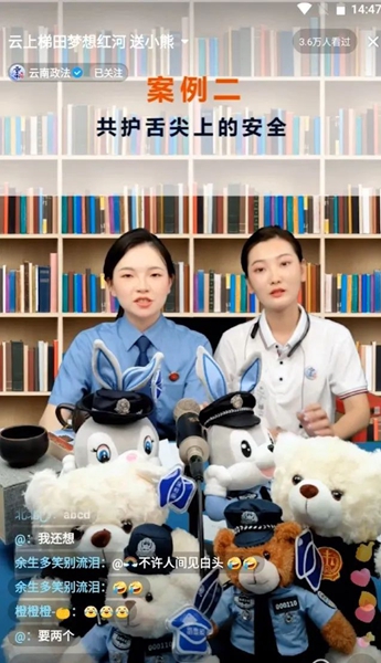 来自红河州公安局的美女警花薛杨、建水县人民检察院的何庚羲、红河州中级人民法院的唐文波以及全国模范人民调解员蒙自市新安所街道大新寨村人民调解委员会王丽明围绕《如何防范电信网络诈骗》《共护舌尖上的安全》《聚焦知识产权保护,避免“法庭上相见”》《家事纠纷难平息温情调解促和谐》四个案例,分别普及相关法律知识。薛杨别俱一新的说唱式普法让人耳目一新,让普法也能很时尚。