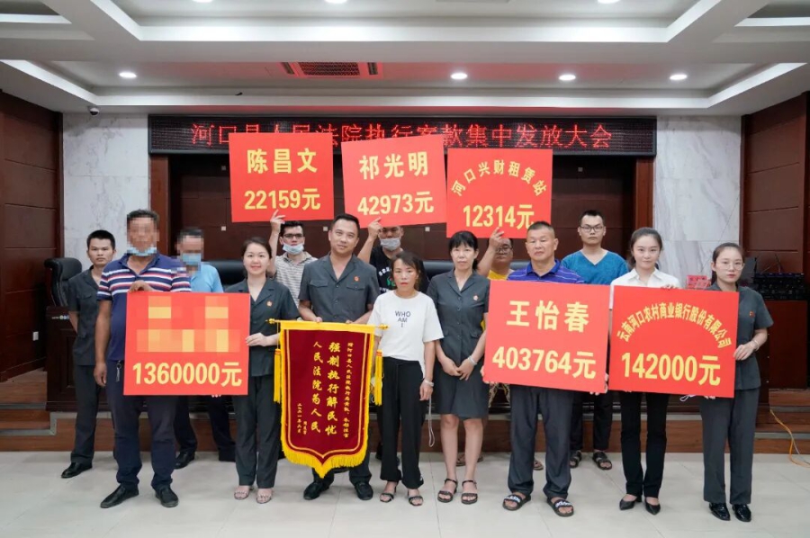 坚持法“护”权益,打造执行款物兑现服务站。开展“红河利剑”专项执行行动,严厉打击“拖、躲、逃、赖”规避执行的行为。全面加强执行工作力度,规范执行程序,严格执行行为,加大联动机制,合力解决执行难问题,缩短执行周期,提升执行实效和实际执行率。2023年来,执结案件2454件,执行到位金额58078.82万元。