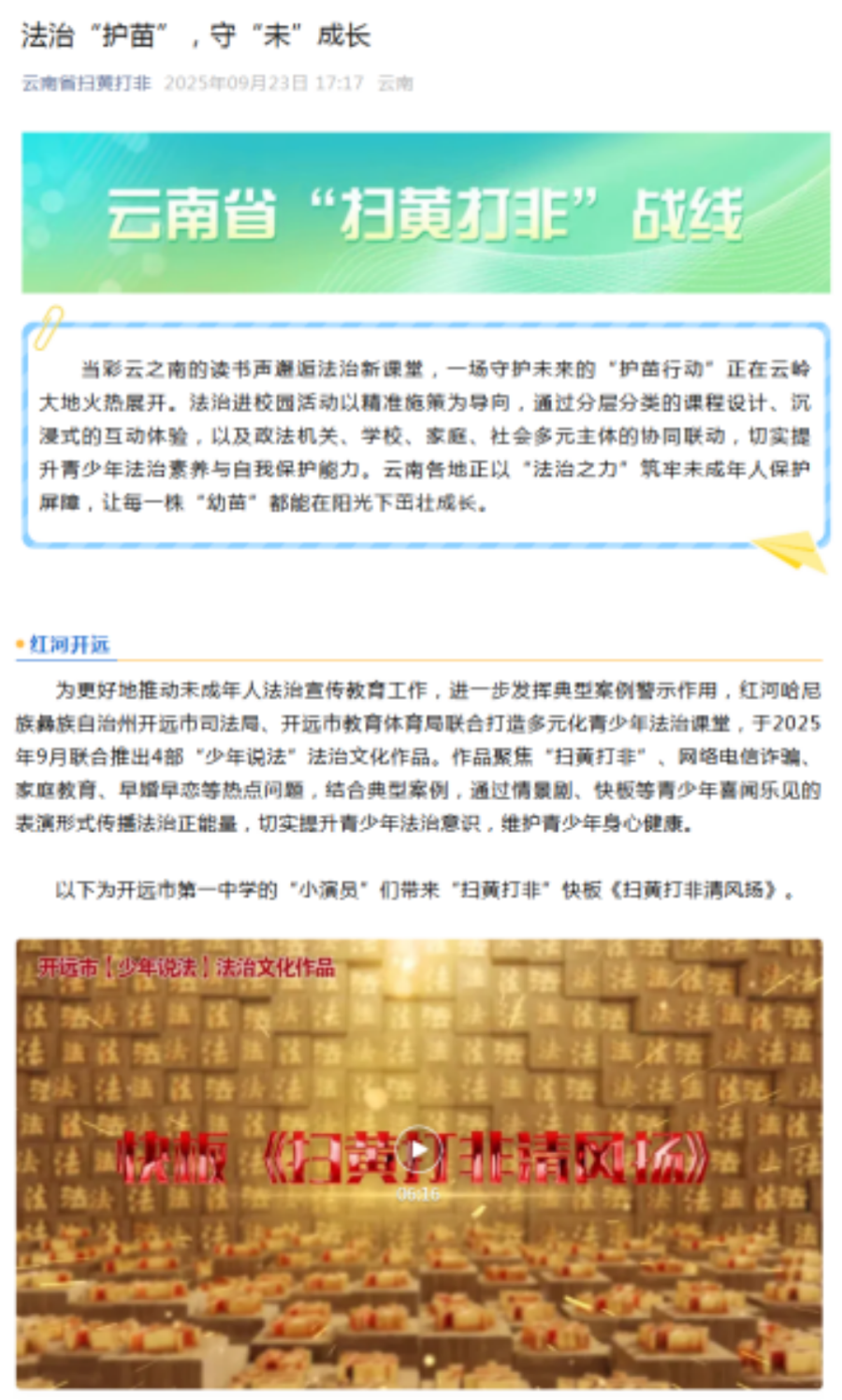 为扩大活动影响力,开远市构建“线下巡演+线上展播”的立体化传播矩阵。2025年9月,以开远市第一中学会堂为起点,举办“开学第一讲”青少年法治宣传暨“少年说法”法治情景剧首演活动,全市9所学校1200余名师生现场观看,市人民检察院检察官现场对节目进行“释法说理”,实现“演出+讲解”的双重教育效果。首演后,“线下巡演”陆续结合家长夜校、开远市2025年国家网络安全宣传周、校园法治文化月等活动深入学校、社区开展演出;“线上展播”通过《开远司法行政》《开远教体》微信公众号等媒体平台展播优秀作品,打破时空限制,让更多青少年及家长便捷观看学习。截至2025年10月10日,共开展“线下巡演”6场次4500人观看演出,线上展播累计点击量达2300人次,《云南省扫黄打非》微信公众号于9月23日推介了《扫黄打非清风扬》视频作品,形成“校园热演、社会热议”的良好氛围。