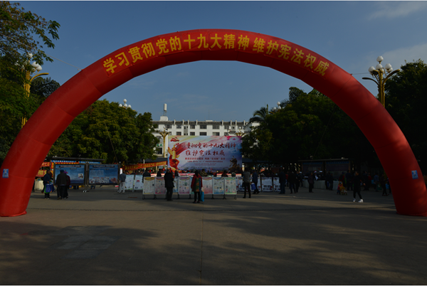 12月4日是第四个国家宪法日,为深入贯彻落实党的十九大精神,增强全民宪法意识,在全州形成学习宪法、尊崇宪法的良好氛围。12月4日上午,以州司法局、蒙自市司法局为牵头单位,由州市两级法院 、检察院、公安、司法行政、财政、安监、消防、民族宗教等30余家单位为成员,在蒙自市南湖广场开展以“学习贯彻党的十九大精神 维护宪法权威”为主题的“12·4”国家宪法日集中宣传活动。