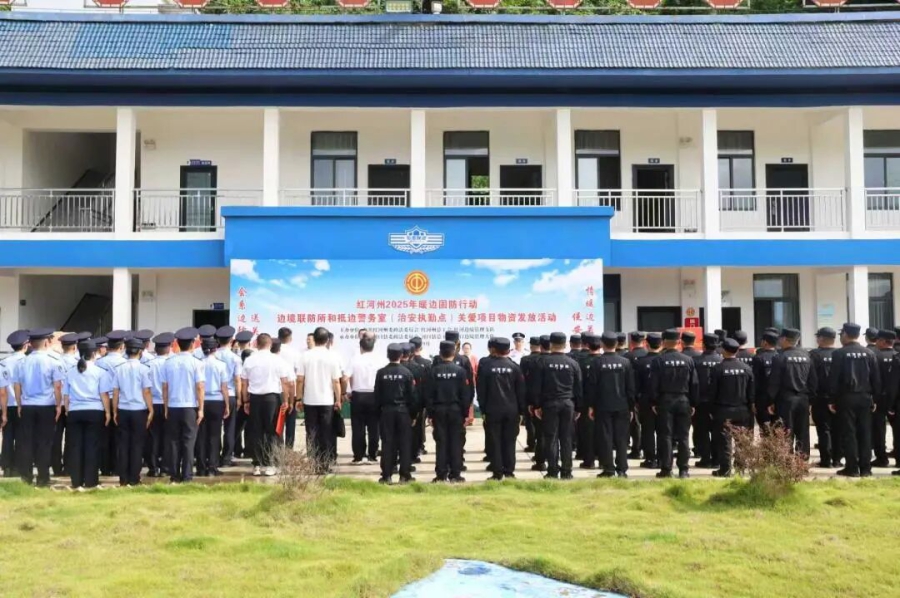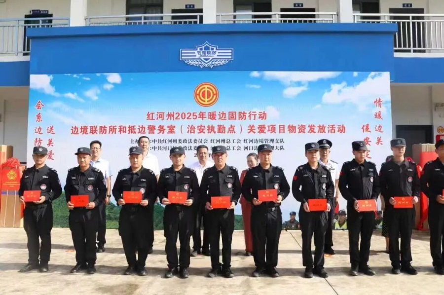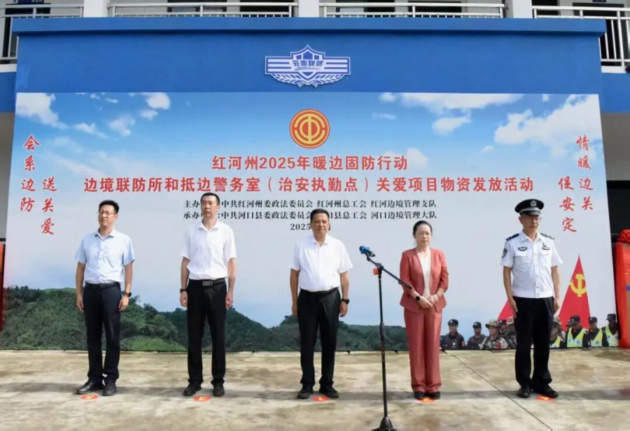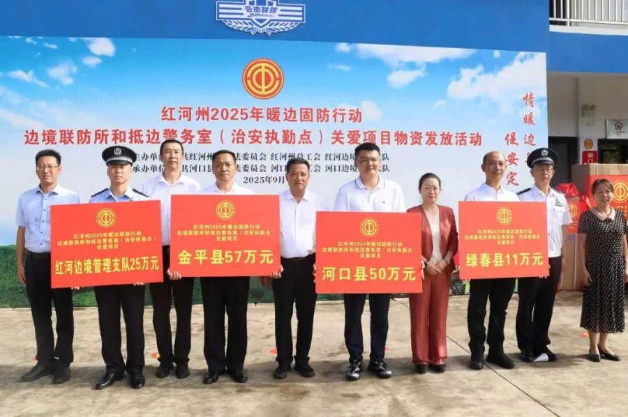 在省委政法委、省总工会、省边防办关心支持下,9月27日,红河州2025年暖边固防行动关爱项目物资发放活动在河口县大湾联防所举行。州委常委、州委政法委书记董万春,州政协副主席、州总工会主席张艳梅,州委政法委(州边防办)、州总工会、红河边境管理支队相关领导,绿春、金平、河口县委县政府、县总工会领导出席活动,河口边境管理大队民辅警、边境联防员代表共计80余人参加活动。