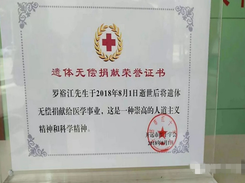 刘怡晴夫妇含着泪遵照老人生前的遗愿为他办完了“身后事”,这简单的“身后事”字眼的背后,却蕴涵着写着大爱的壮举!因为随后,老人的遗体将由红十字会交付给专门的医疗科研机构,继而实现了罗裕江老人捐献遗体的最终夙愿。