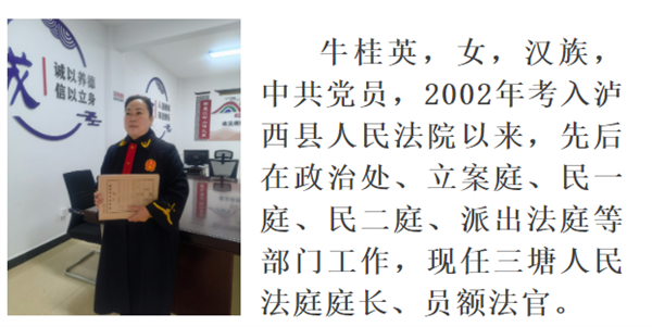 她总在组织需要的时候勇挑重担,迎难而上。2016年司法改革,她凭借自己的努力成功入额,2017年即到金马法庭工作,扎根基层一线。2021年1月服从院党组安排又到中枢法庭工作。2021年9月三塘法庭正式挂牌成立并实体化运行,管辖泸西县三塘、向阳、永宁三个山区乡镇,地处高寒山区,环境较为恶劣。但她二话不说,服从安排马上到三塘法庭工作。自2017年1月至2022年9月30日,牛桂英共审理各类民商事案件948件,审结933件,结案率98.42%,调解撤诉671件,调撤率达71.92%;自审自执案件361件。