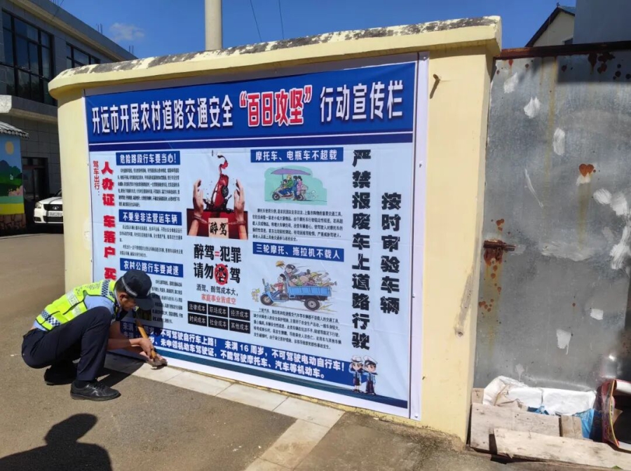 为全力防范化解农村地区道路交通安全风险,有效预防和减少道路交通事故,守护农村群众出行安全,开远市公安局交通管理大队聚焦“事故下降、重大事故不发生”目标,掀起农村道路交通安全百日攻坚热潮,从源头、路面、宣传三端发力,给乡亲们的出行系上“安全带”。